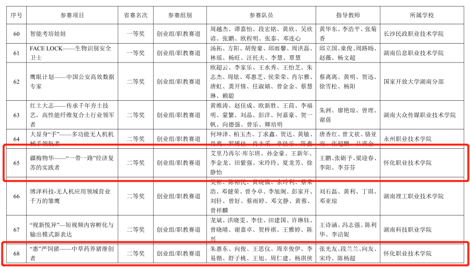 近日,湖南省教育厅公布了“建行杯”第九届湖南省“互联网+”大学生创新创业大赛获奖名单,我校共获金奖2项、银奖2项、铜奖2项,“优秀创新创业导师”10名,优秀组织奖2项。获奖数量、优秀创新创业导师数量创历史新高。