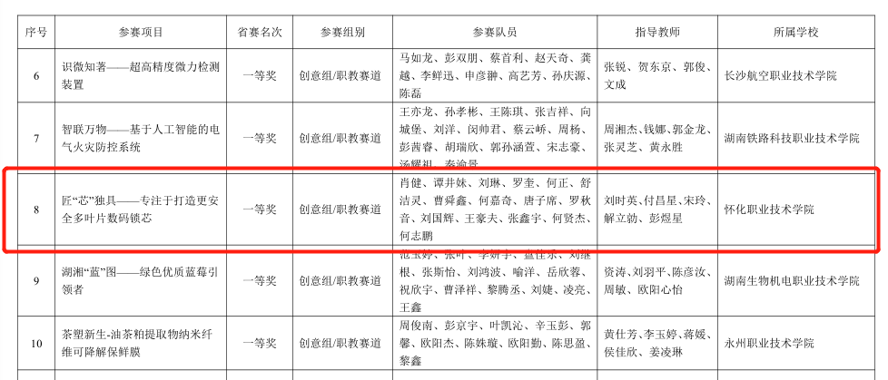 我校历来高度重视技术技能型人才培养和职业技能竞赛工作,坚持以金种子精神赋能,以赛促学提升实践能力。我校学生先后在全国职业院校技能大赛、第八届中国国际“互联网+”大学生创新创业大赛中荣获银奖、一带一路暨金砖国家技能发展和技术创新大赛中荣获一等奖,实现了国赛一等奖零的突破。同时,我校还成功承办“楚怡杯”湖南省职业院校技能竞赛导游服务赛项和全国职业院校技能比赛湖南省选拔赛高职组视觉艺术设计赛项。接下来,学校将继续立足学生全面发展和服务区域经济社会发展,以大学生创新创业训练计划项目为抓手,深度挖掘培育参赛项目,激发学生创新思维、创新精神和创新能力,持续提高应用型技能人才培养水平。